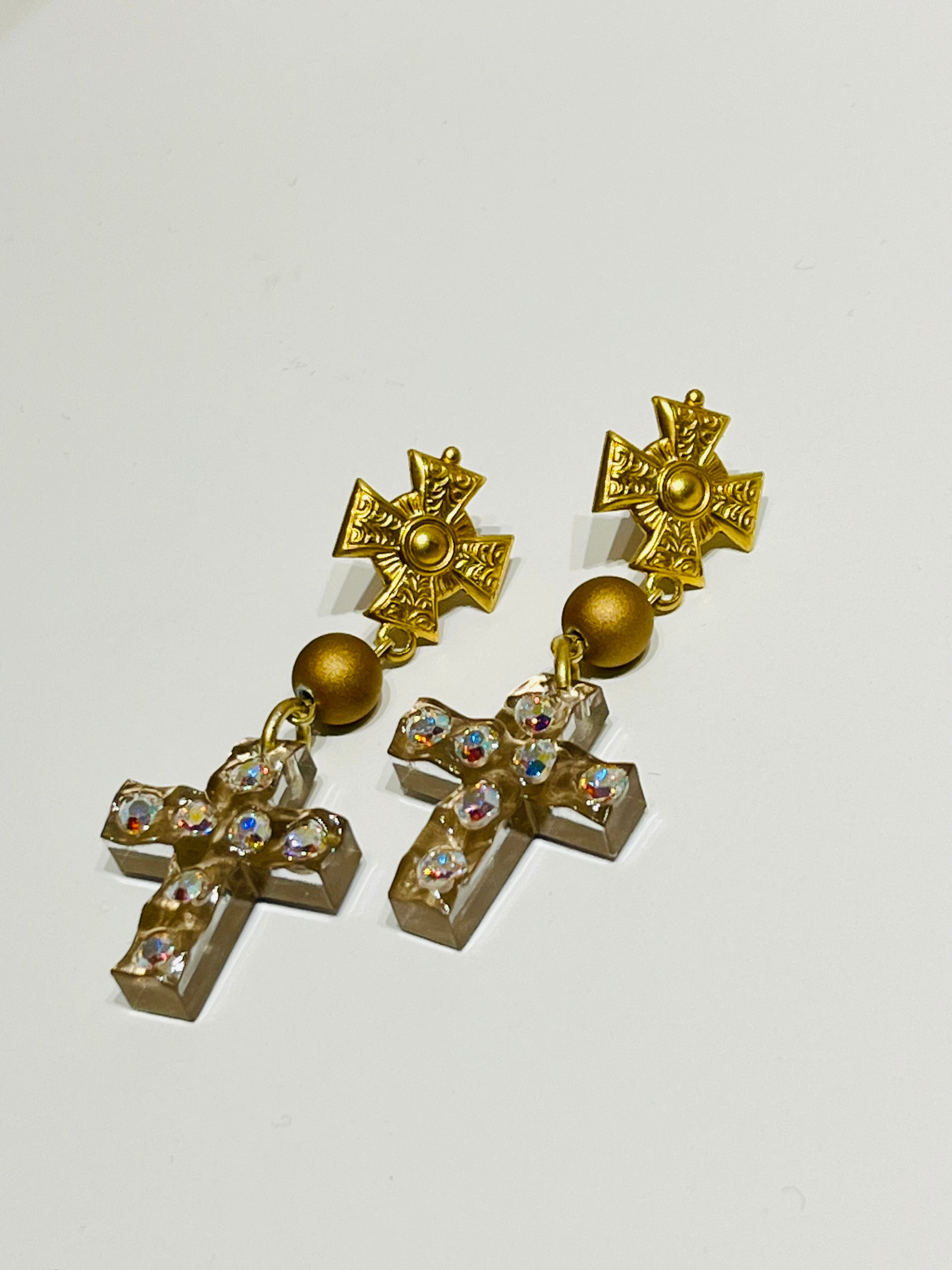 バロック調のチャームにハニーオーロラのクロスが揺れるイヤリング。シックな装いにもカジュアルな装いにもお役立ていただけます。