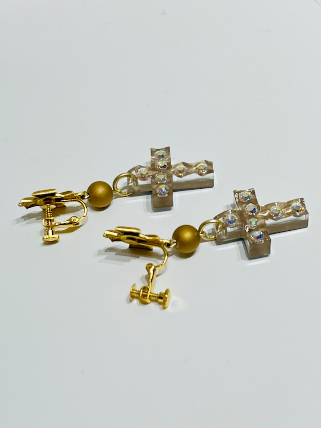 バロック調のチャームにハニーオーロラのクロスが耳元で揺れるピアス。