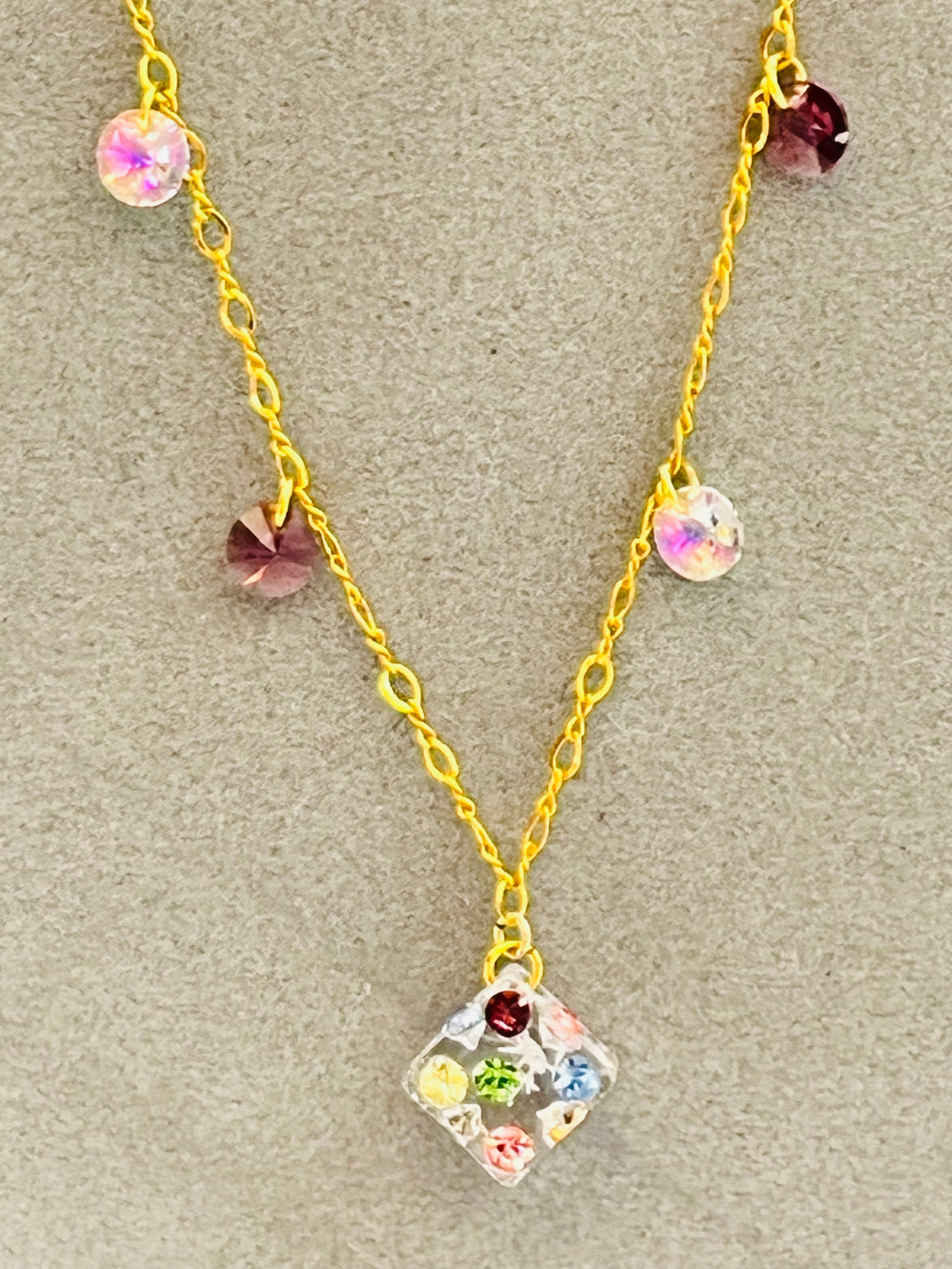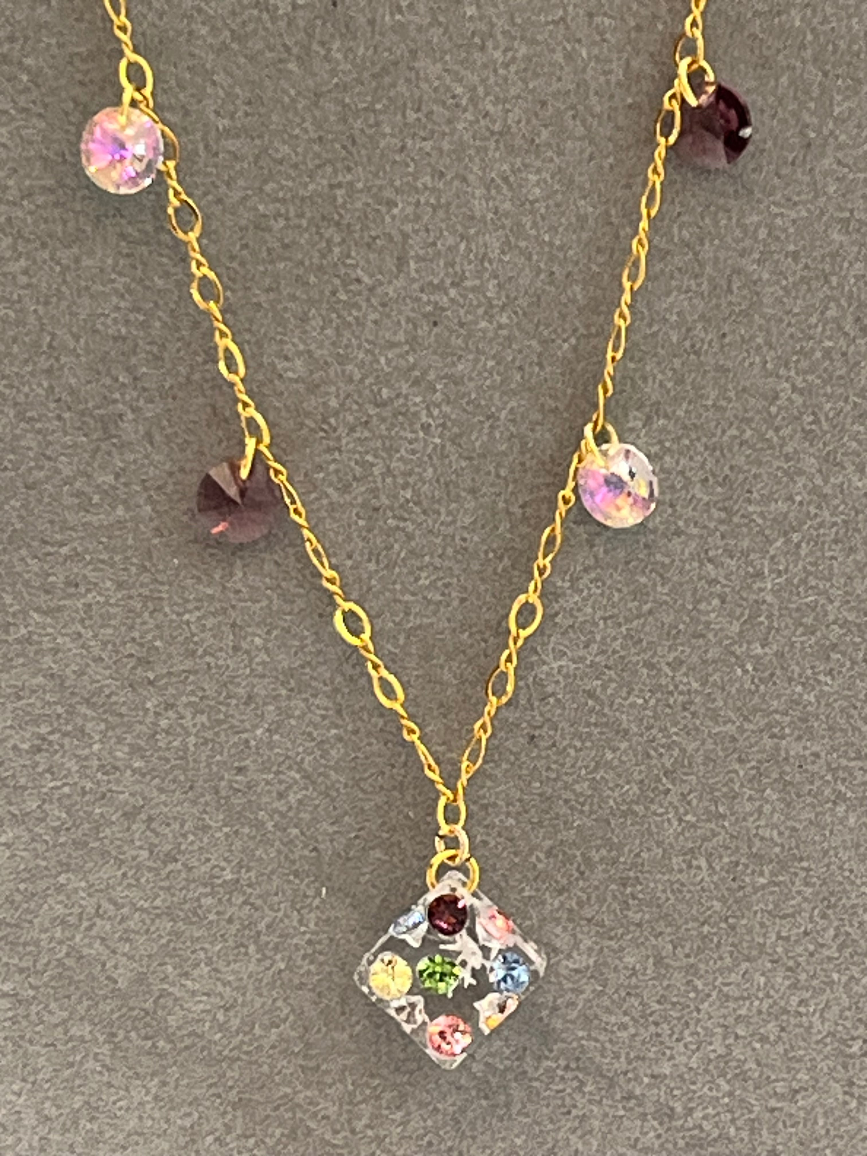 ゴールドフィルドチェーンにドミノマルチとストーンをあしらったネックレス。