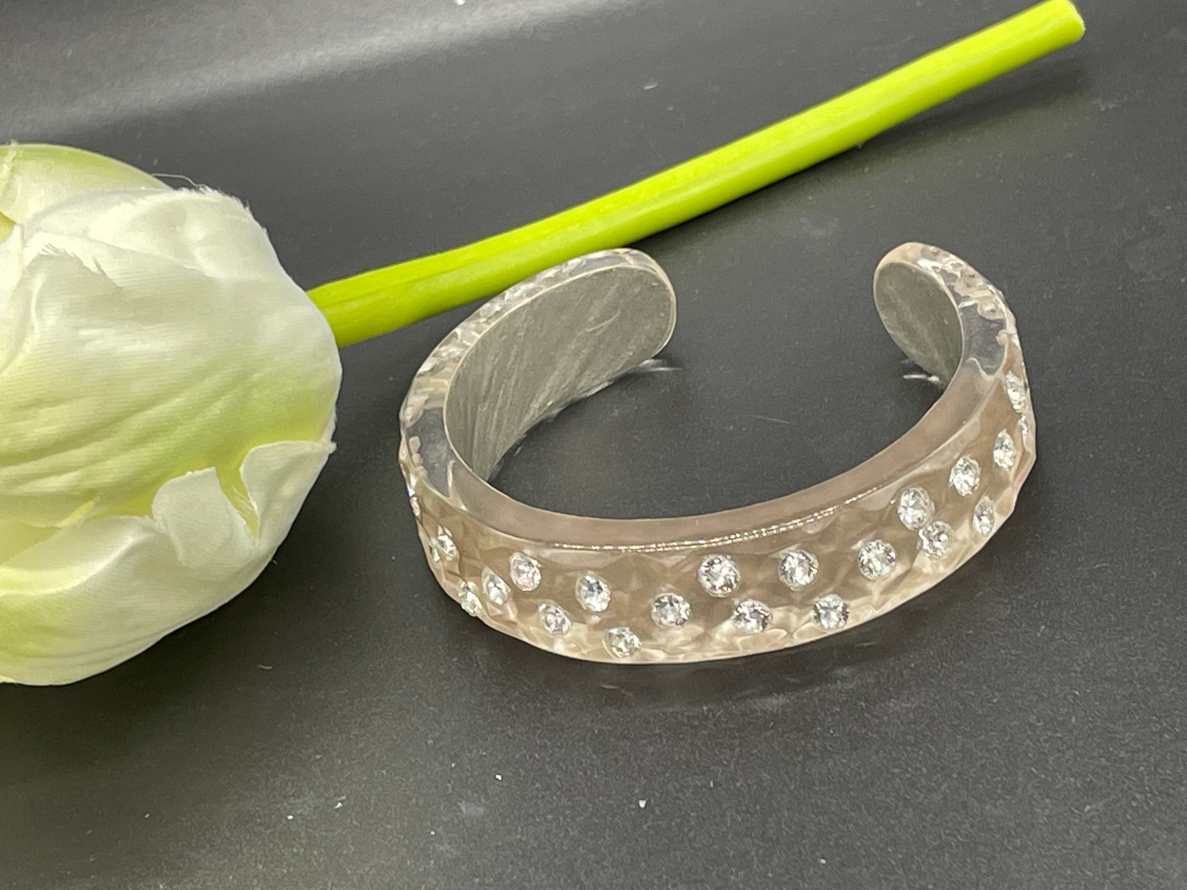 一番細いタイプのバングルです。六角形の形の中にダイヤの石がうめこまれています。シンプルな上品さがあるデザイン。幅は1.5センチとなっています。
