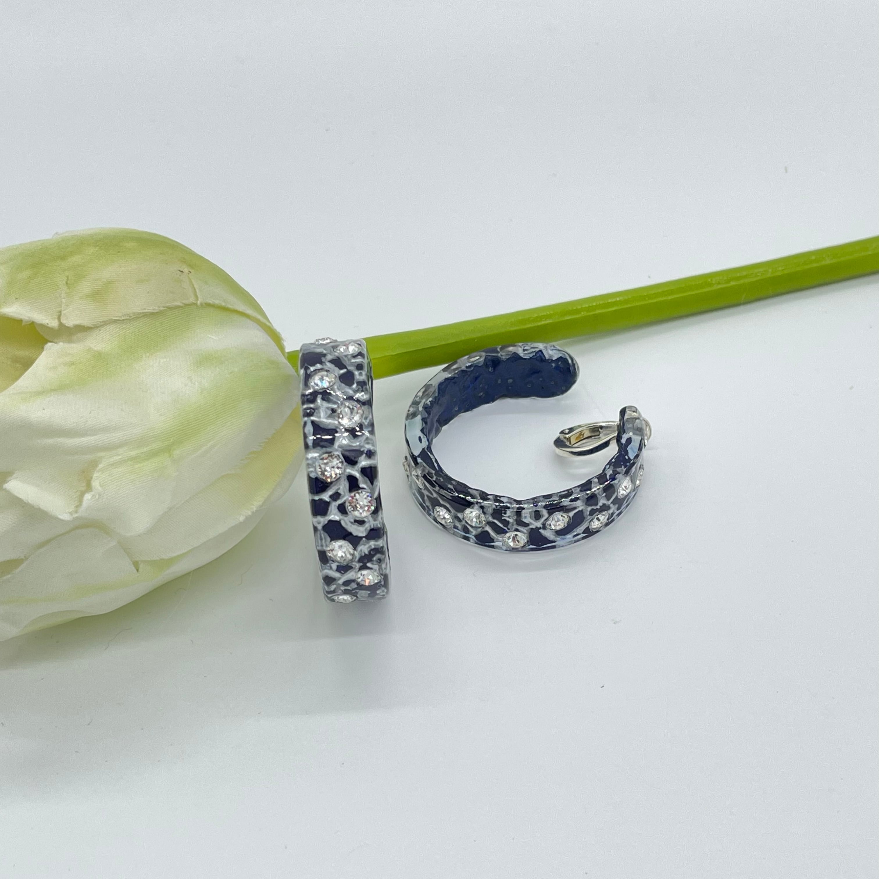ネイビーにシルバーのモナーク柄にダイヤのクリスタルガラスをあしらったデザイン。ネイビーとシルバーというシンプルな色合いで、品のあるゴージャス感があるイヤリングです。