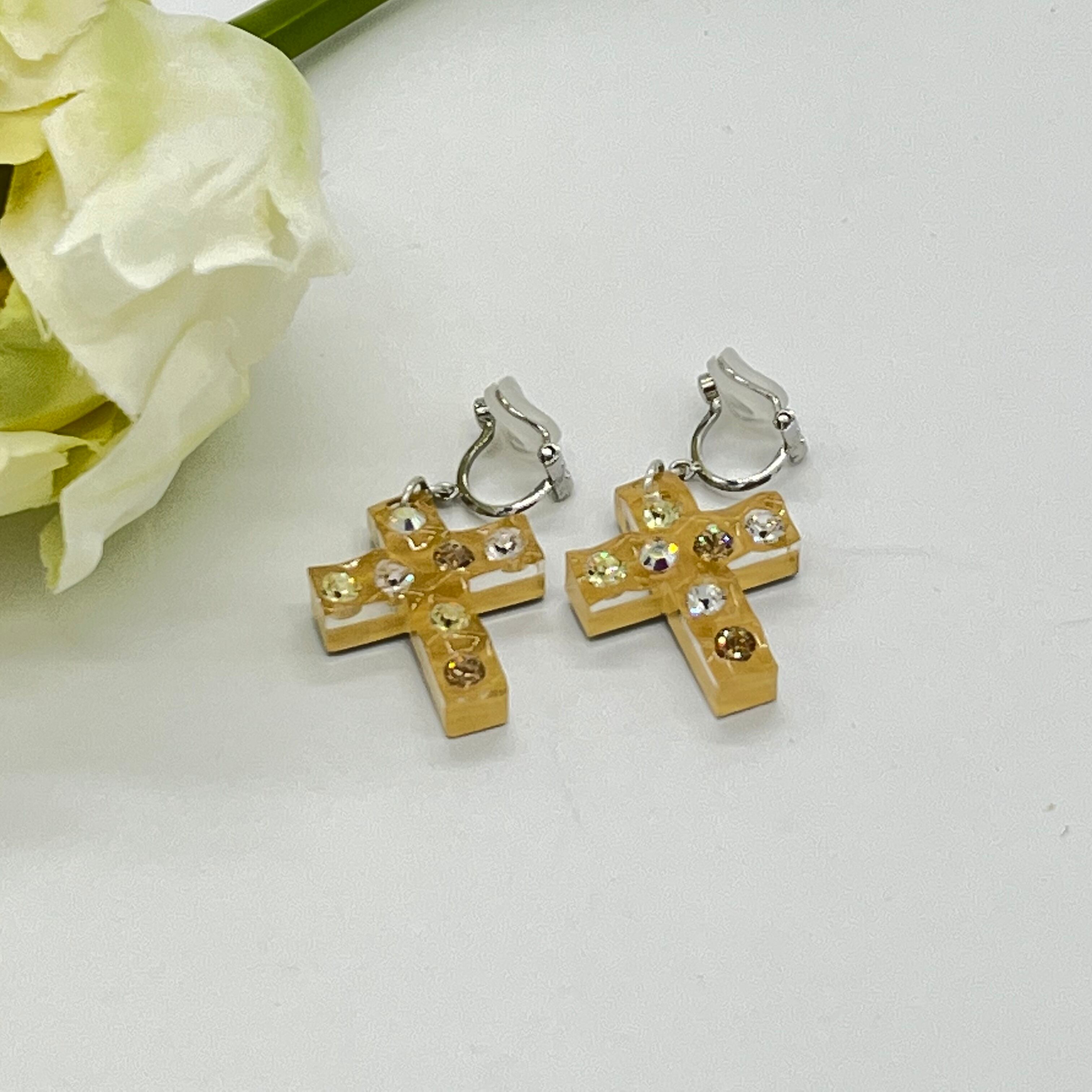 アプリコットカラーにダイヤ、オーロラ、ゴールドのクリスタルガラスをあしらったクロス型のイヤリング。耳元にキュートな印象を与え、ポイントカラーにおすすめです。また耳元ででの揺れ感も素敵なイヤリングとなっております。縦2.5㎝、横2㎝。